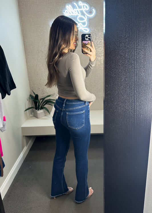 Alula Mid Rise Distressed Hem Crop Flare Jeans