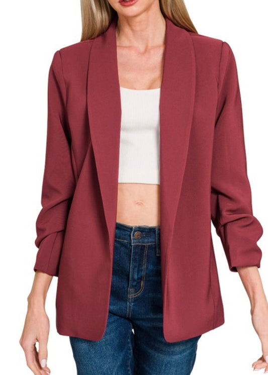 Devin Woven 3/4 Ruched Sleeve Open Front Classic Blazer
