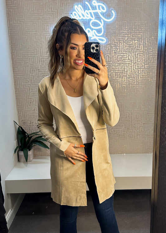 Milla Long Sleeve Two Zipper Detail Faux Suede Long Jacket