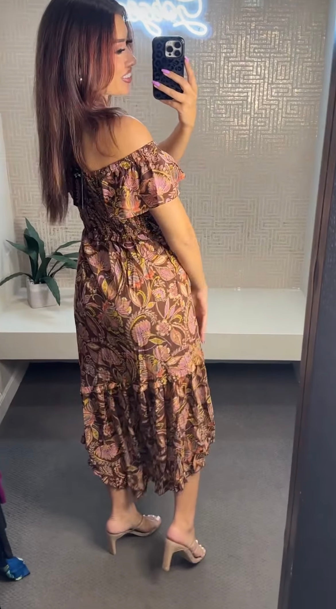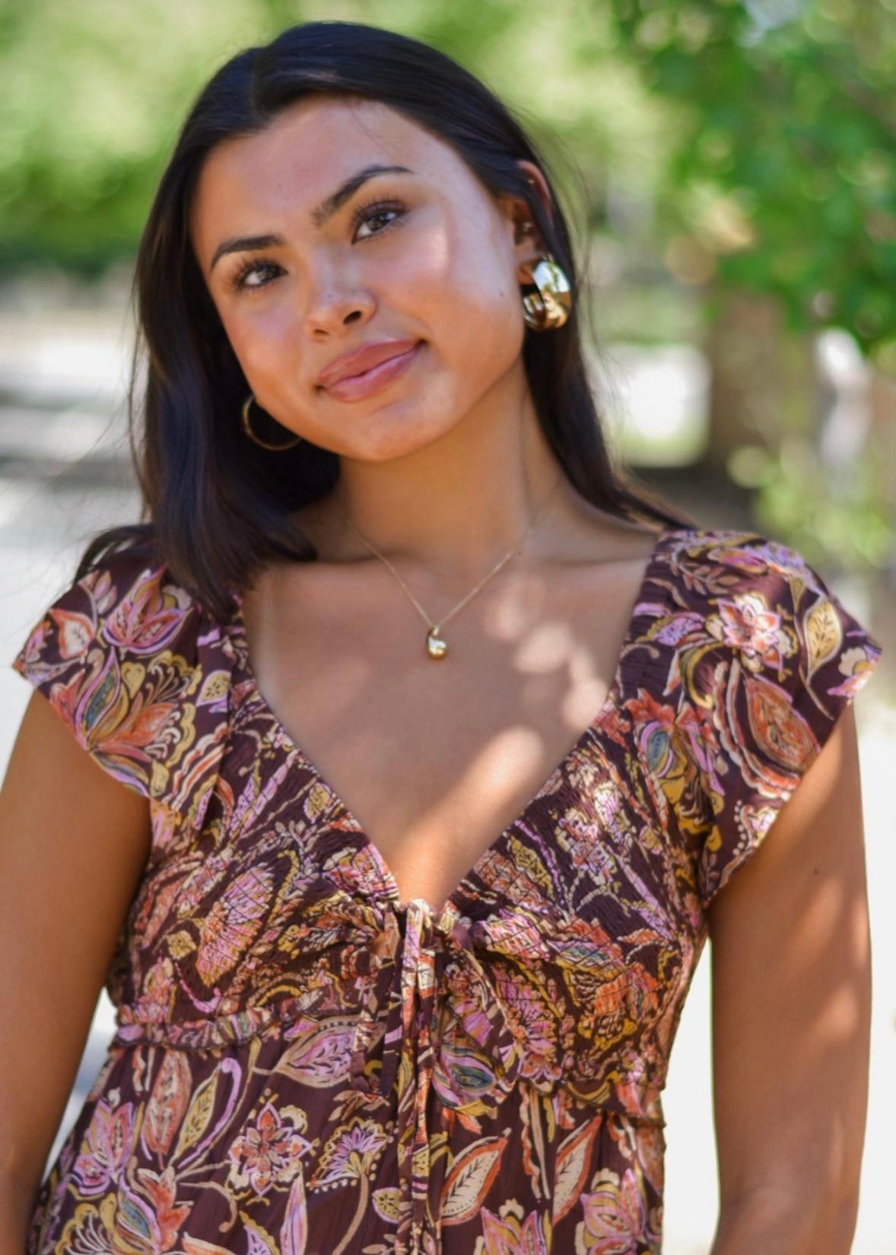 A flowy maxi dress featuring a smocked bust, flattering V-neckline, flutter sleeves, and an elegant irregular hem for effortless charm.