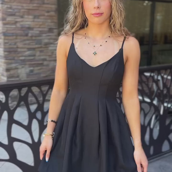 This woven mini dress features skinny straps and a pintuck waist, offering a flattering fit with a lightweight feel that's perfect for warm weather.