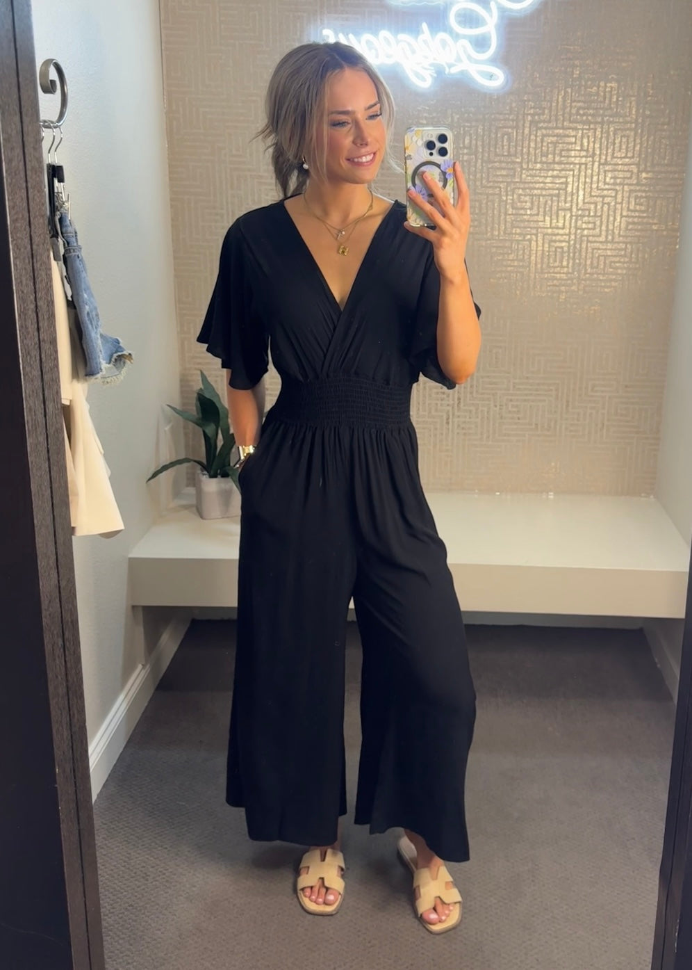 Short sleeved heavy gauze jumpsuit with surplice neck smocked waist wide leg pants and back tie detailing.