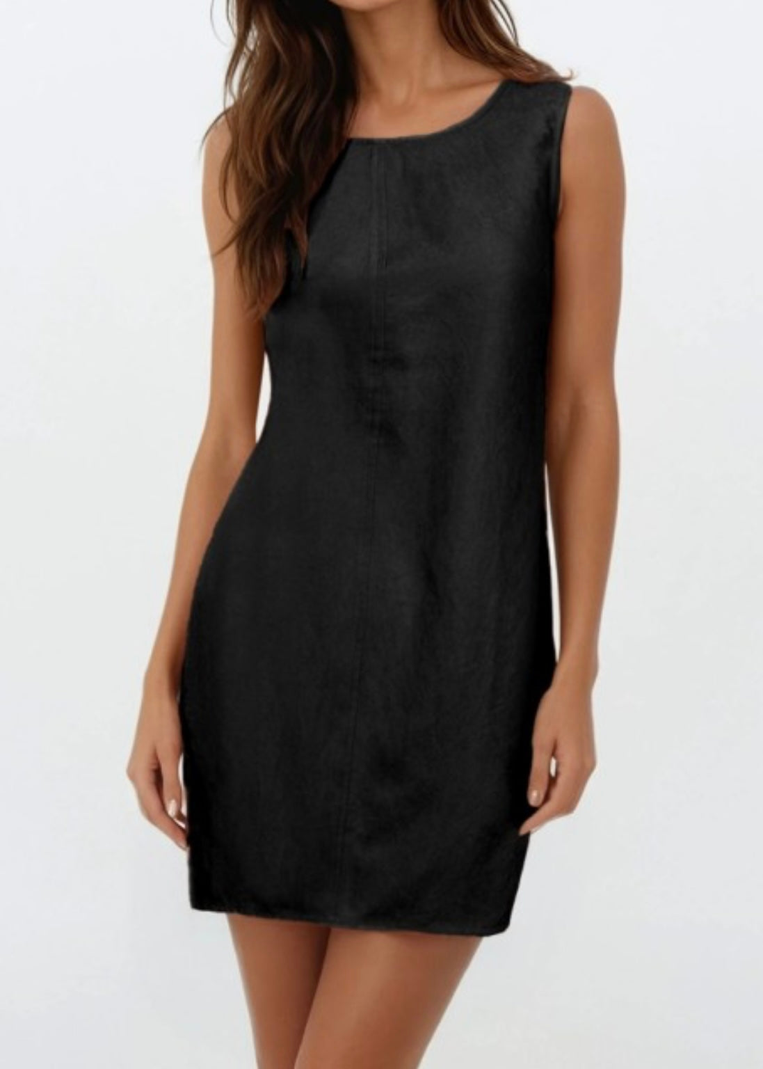 Sleeveless soft matte mini shift dress.