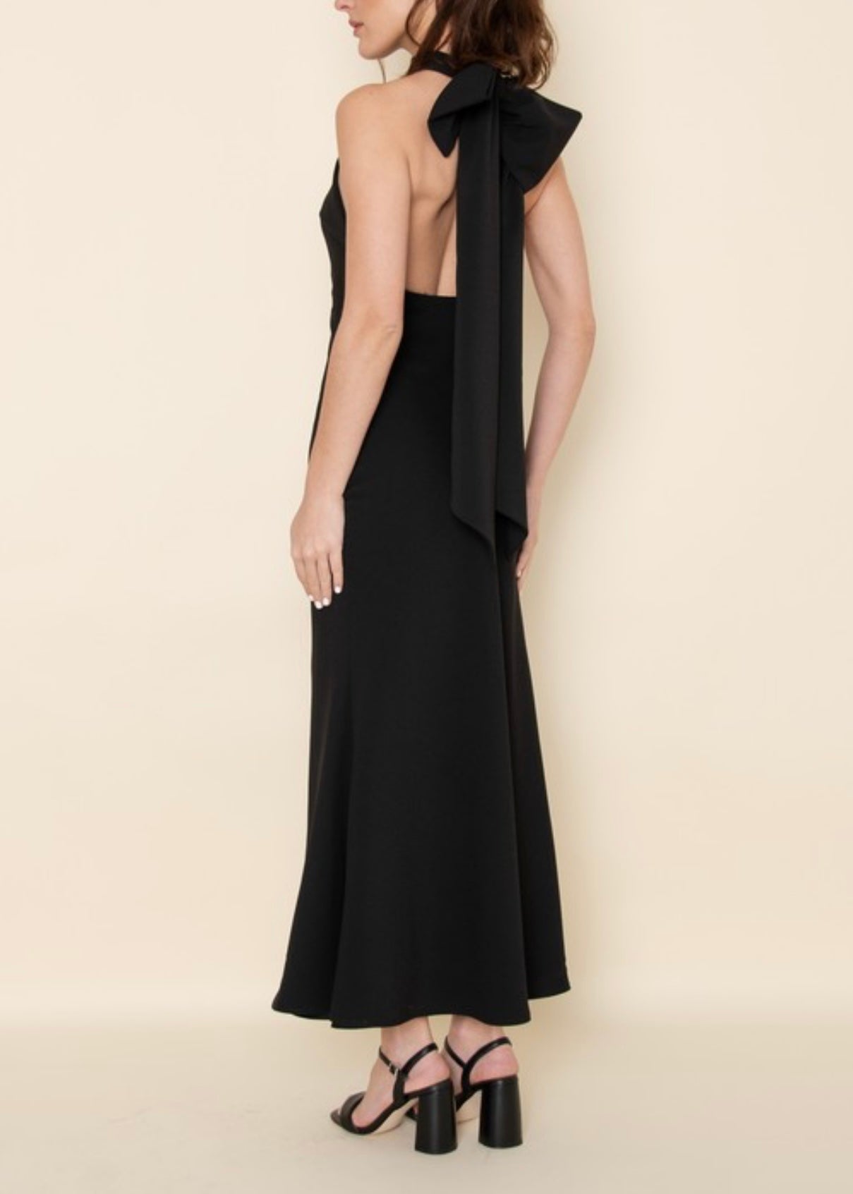 Bias cut midi dress with halter neckline, and a bow back detail includes side zipper closure and neck button closure.