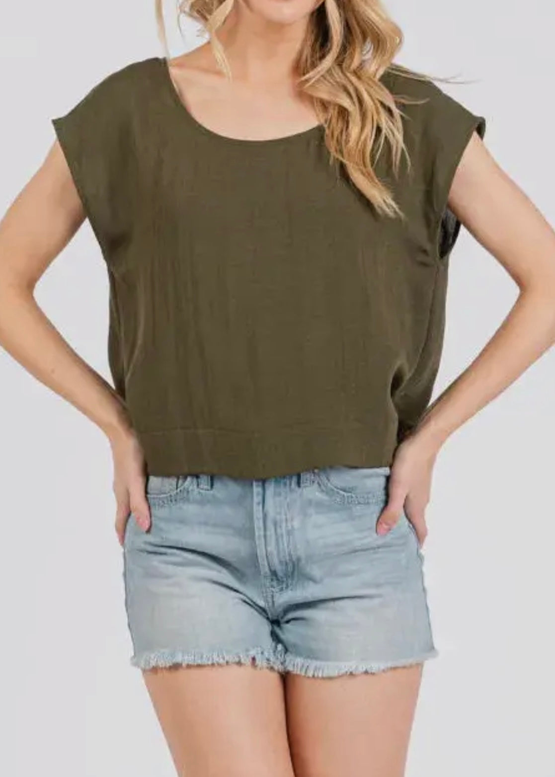 WOVEN BOXY TOP WITH EXTENDED SLEEVE AND ROUND NECK.