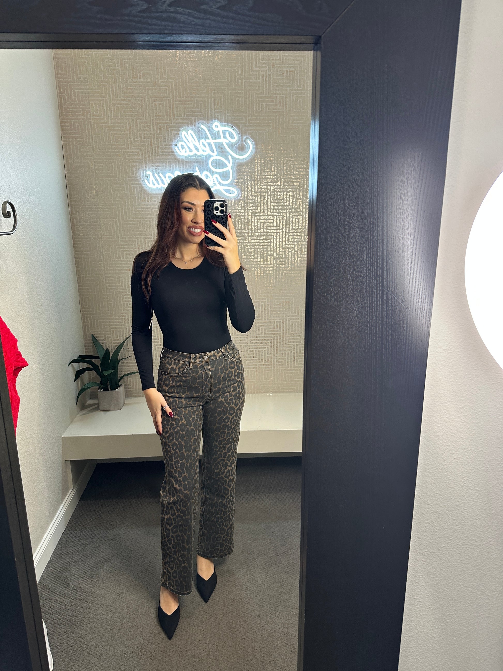 Vixen High Rise Leopard Print Slim Wide Pants are crafted from comfort-stretch denim with a flattering high-rise waist, five-pocket design, finished hem, and full-length slim wide-leg silhouette in bold leopard print.
